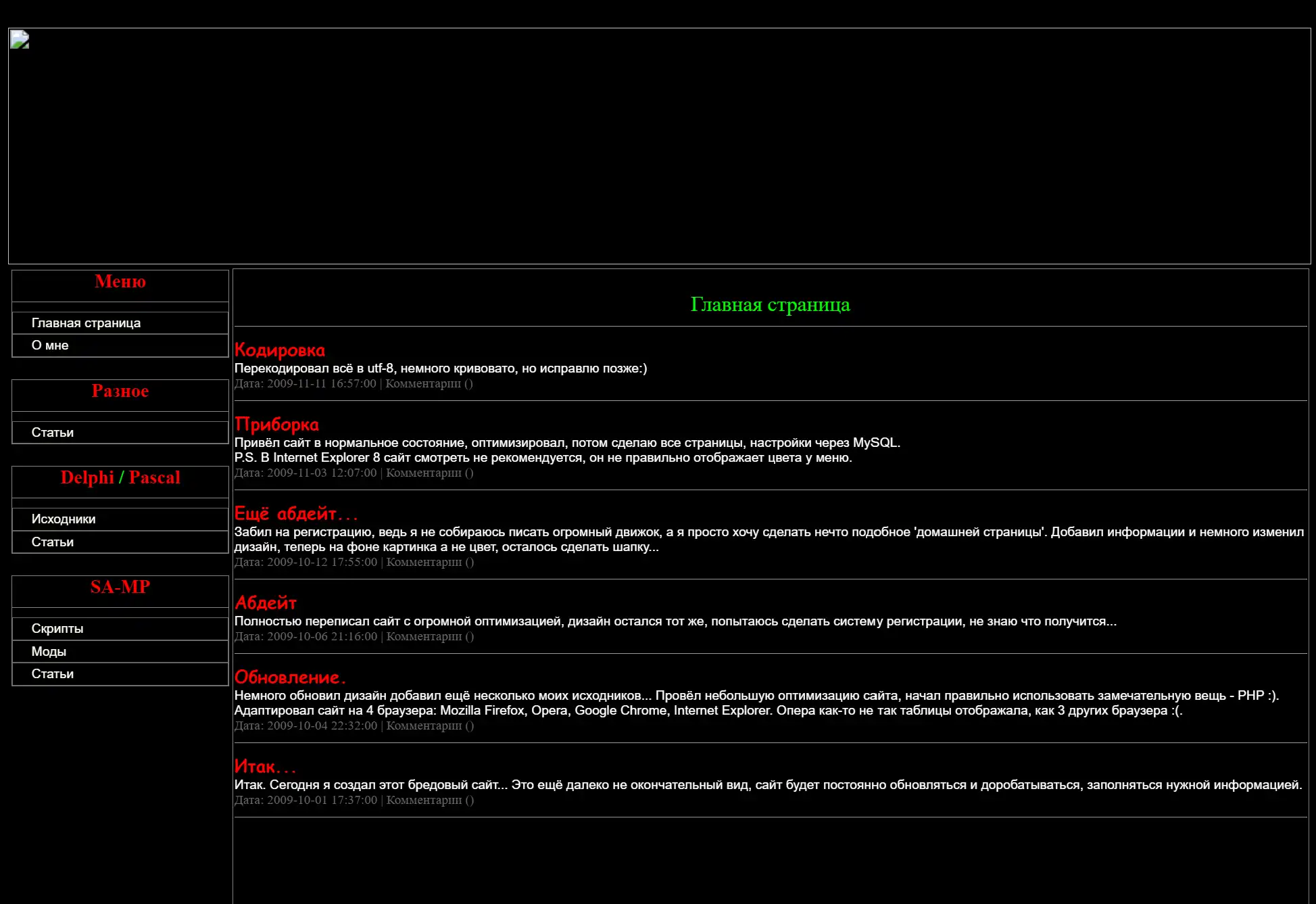 Первая версия сайта была написана на HTML + PHP в 2009 году, тогда я только учился писать сайты. Выглядела она так (взято и вебархива):
